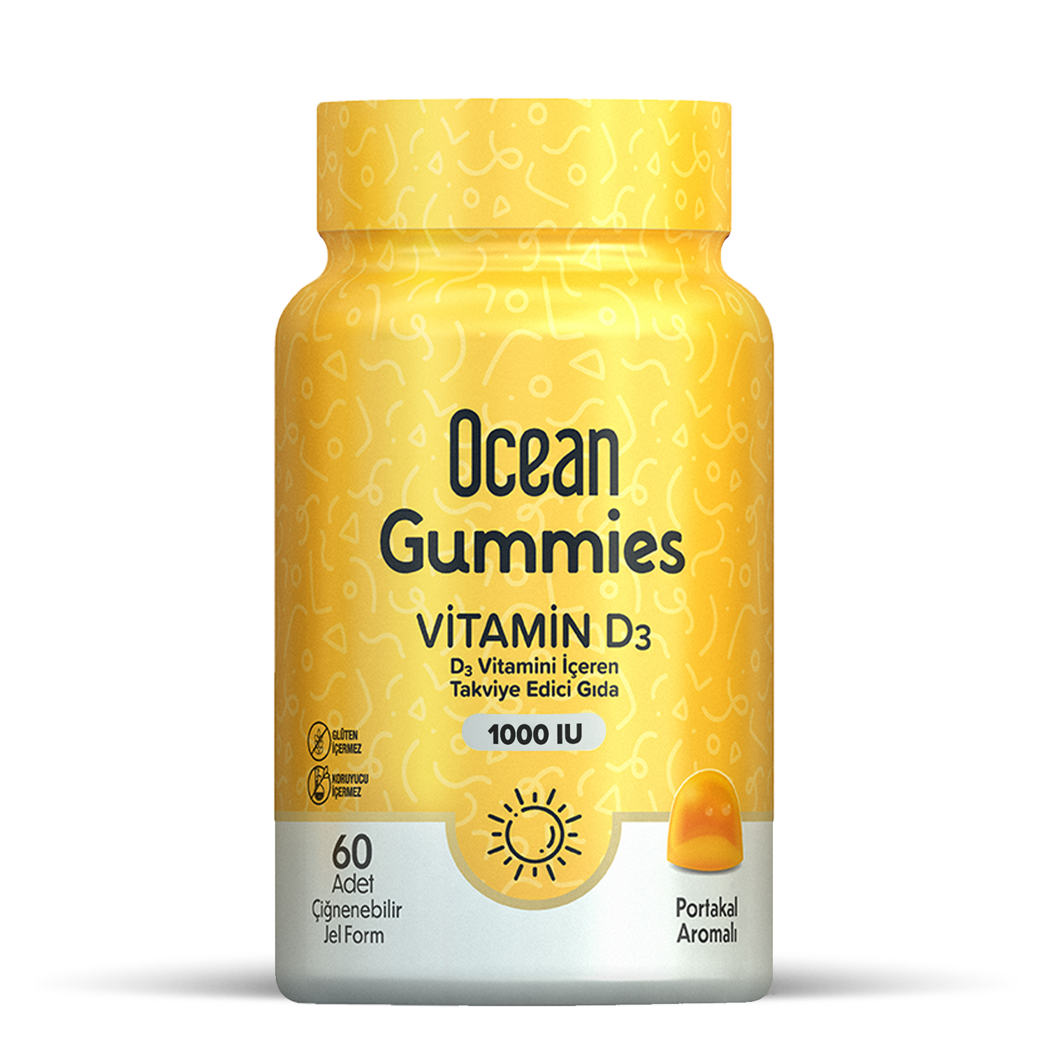Portakal aroması ile lezzetli bir deneyim sunar.Ocean Gummies Vitamin D3 glukoz şurubu, jelatin, yapay tatlandırıcı ve koruyucu, yapay renklendirici içermez.